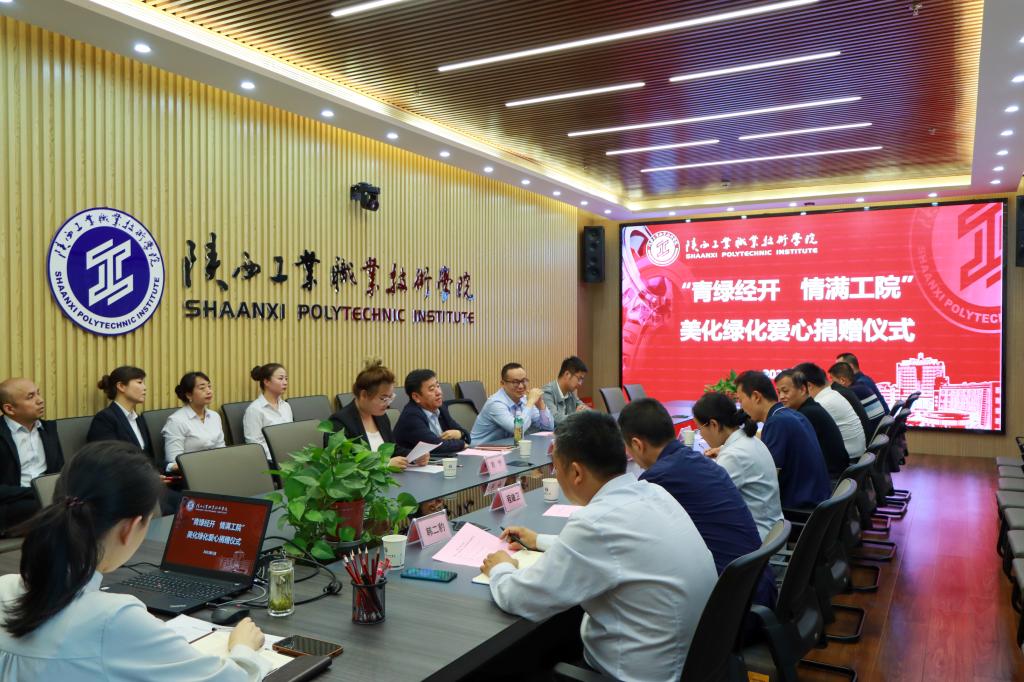5月30日下午,“青绿经开 情满工院”美化绿化爱心捐赠仪式在经开校区图文信息中心7层会议室举行。北京精雕科技集团西安分中心副总经理关山、咸阳一都商务酒店有限公司董事长高瑞平、陕西彩食之家商贸有限公司总经理张伟、陕西沐云水天餐饮管理有限公司总经理刘宁,我校党委副书记贺天柱,以及学校相关部门负责同志出席了捐赠仪式。仪式由经开校区管委会综合办公室主任李龙主持。