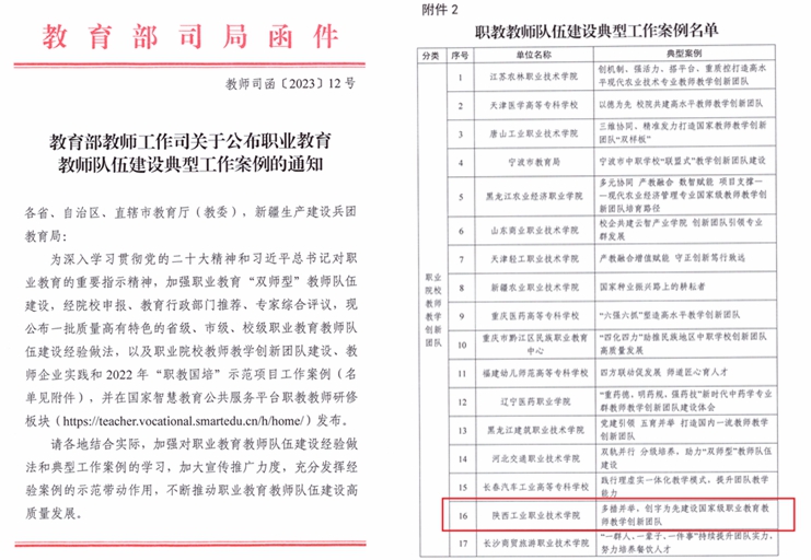 近日,教育部教师工作司公布了“职业教育教师队伍建设典型工作案例”,全国共有67所高职院校优秀案例入选,其中,入选学校教师队伍建设经验做法33个,入选职教教师队伍建设典型工作案例36个。我校报送的《多措并举,创字为先建设国家级职业教育教师教学创新团队》案例成功入选。