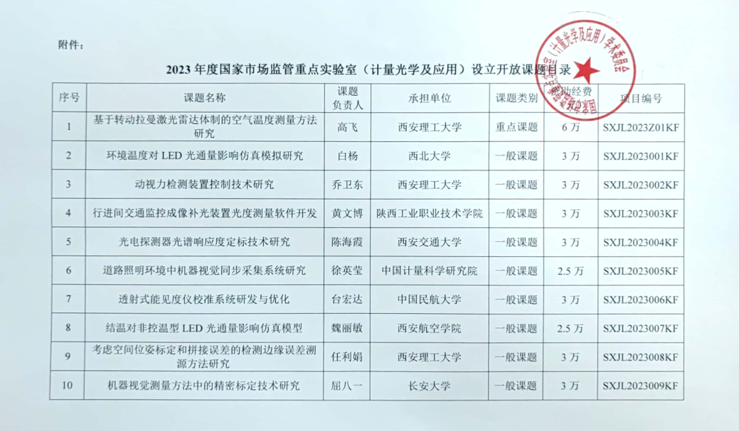 该课题经过前期申报和评审组的现场评议,国家市场监管重点实验室(计量光学及应用)学术委员会最终评审,西安理工大学、西北大学、陕西工业职业技术学院等8所院校共立项开放课题10项,资助研究经费合计32万元。