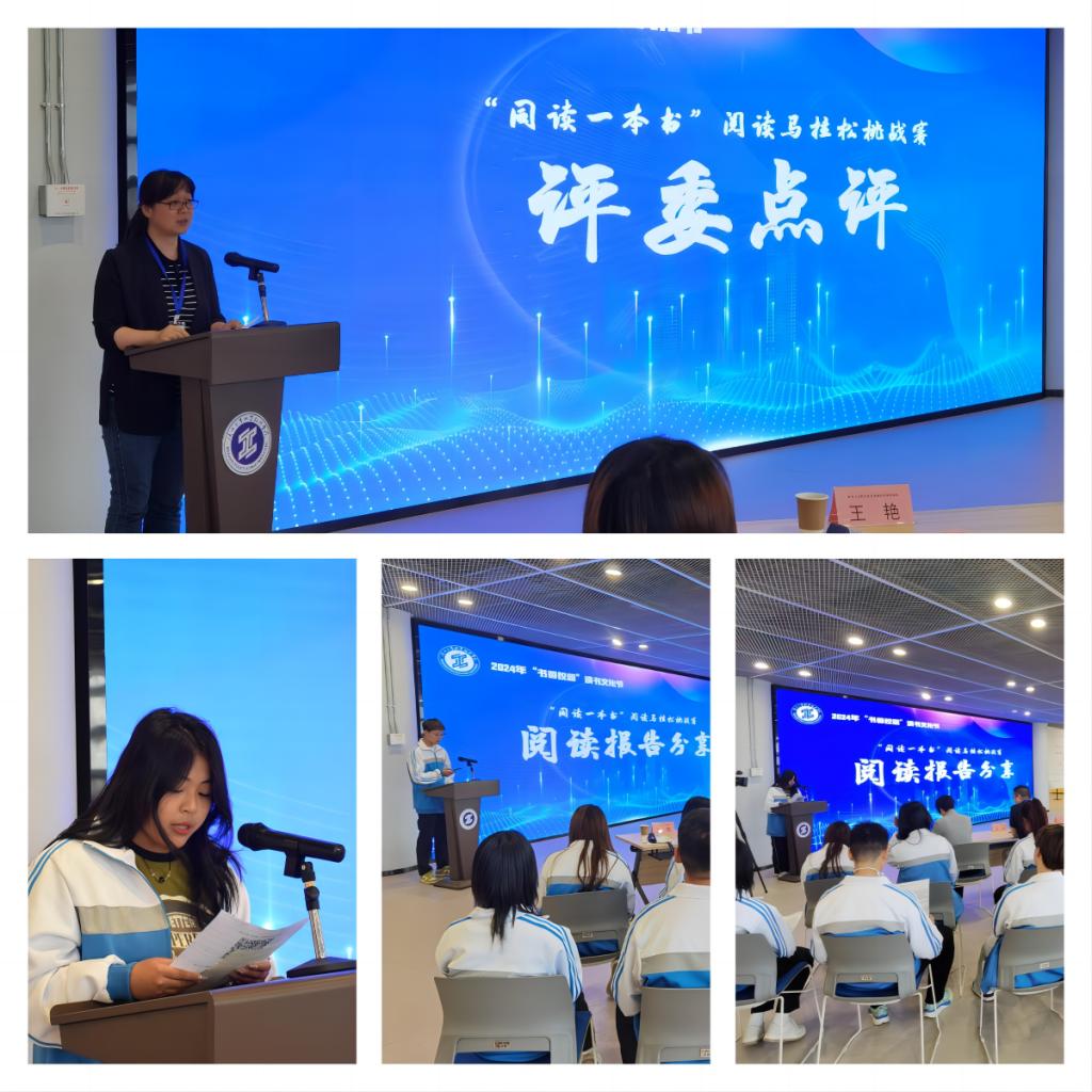 在“同读一本书”阅读马拉松挑战赛交流环节,参赛代表李维洁、陈佳乐、牛立群、赵碧莹、亢晓蓉、吴佳龙分享了阅读报告,评委代表公共课教学部部长赵娇对本次阅读报告进行了精彩的点评。她指出,通过阅读报告看到了三个亮点,一是报告内容旁征博引,显示出大学生平时阅读之广,积累之足;二是充分体现了“品”的能力,体现了同学们对作品内涵的理解;三是看到了读者独到的见解。针对报告中存在的问题,赵部长提出建议,希望同学们提升报告规范程度和研究执行能力,不拘泥于问题深度理解作品内涵,加强团队合作保证报告整体均衡。她希望大家借助阅读马拉松的平台多读书、读好书,在阅读中建设自我,带着青年人的自信昂首挺胸,投入到国家新时代的伟大建设中来。