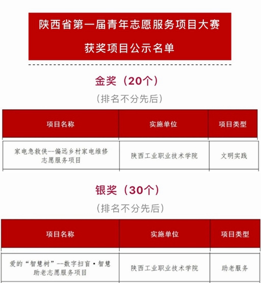 近日,由团省委、省委社会工作部、省交通运输厅、省水利厅、省文化和旅游厅、省卫生健康委等单位共同指导,陕西省青年志愿者协会主办的陕西省第一届青年志愿服务项目大赛评审结果公布。经前期项目申报、省赛初评、省赛终评、团省委审定等环节,我校《家电急救侠——偏远乡村家电维修志愿服务项目》荣获金奖、《爱的“智慧树”——数字扫盲·智慧助老志愿服务项目》荣获银奖。两个项目分别为金奖、银奖中唯一获奖的省内高职院校。