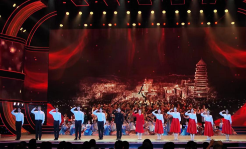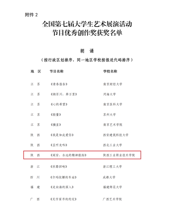 6月13日晚,我校原创朗诵作品《延安,永远的精神航标》在朗诵专场中精彩亮相,与来自全国各地的30所高校同台竞演,荣获艺术表演类一等奖,优秀创作奖。《延安,永远的精神航标》由我校客座教授杨焕亭老师精心创作,以讴歌延安精神为主题,用情真意切的语言描绘出延安的峥嵘岁月图景,引导广大青年坚定理想、胸怀家国、奋力筑梦;展演现场,同学们以饱满的热情和精彩的演技,展现了我校学子的文化素养和青春风采。演出前,学校党委副书记贺天柱到现场看望了参演师生,对老师和同学们的辛苦付出给与了肯定与鼓励。