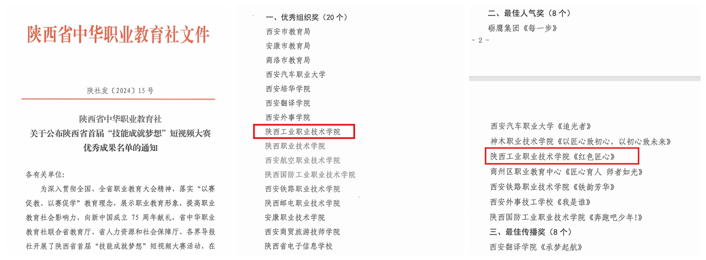9月27日,由省委统战部指导,省教育厅、省人力资源和社会保障厅、省中华职业教育社和各界导报社主办的陕西省首届“技能成就梦想”短视频大赛颁奖典礼暨陕西职教献礼新中国75周年华诞专题活动在西安举行,我校报送的原创短视频作品《红色匠心》获最佳人气奖,学校获“优秀组织奖”。
