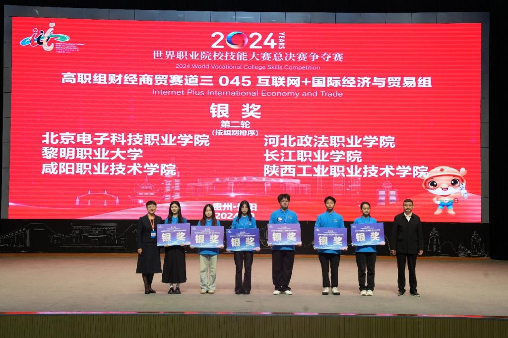 10月27日—10月29日,2024年世界职业院校技能大赛总决赛争夺赛高职组财经商贸赛道三 “互联网+国际经济与贸易”赛项在贵州交通职业大学举办。由我校商贸与流通学院程天一、王鑫宇指导的学生杨卓谦、牛佳怡、陈秦怡、骆婉清团队在比赛中荣获银奖。