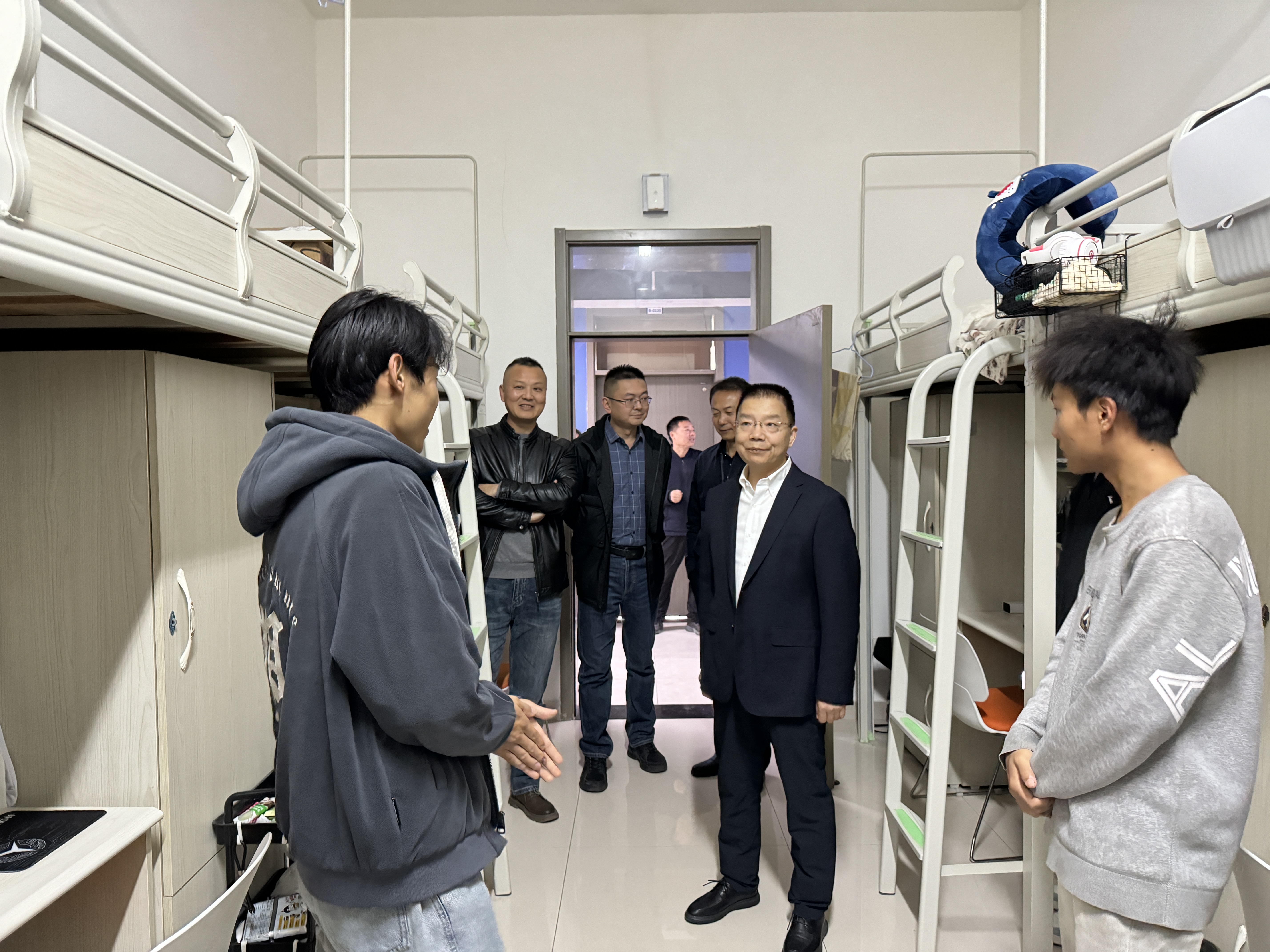 惠朝阳书记一行先后前往成善园、上善园公寓区,对公寓周边环境、学生宿舍环境卫生、安全保卫、消防设施配备、学生浴室等重点区域实地调研。与学生亲切交谈,详细了解、慰问学生学习生活情况。惠朝阳表示,希望大家进一步提高思想认识,系统性思考公寓管理工作,高标准开展学生公寓服务管理。