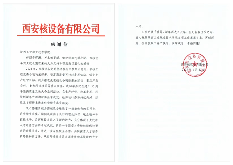 2025春节来临之际,西安核设备有限公司向我校发来感谢信,感谢我校为西核设备输送了一批批优秀的实习生。