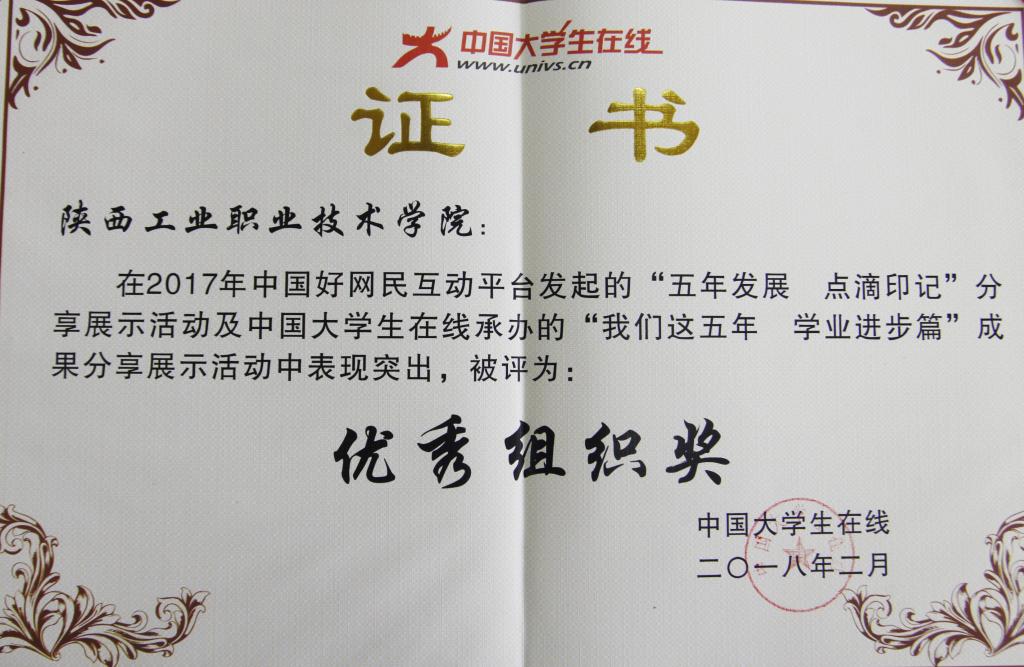 近日,接中国大学生在线通知,我院在2017年中国好网民互动平台发起的“五年发展,点滴印记”分享展示活动及中国大学生在线承办的“我们这五年 学业进步篇”成果分享展示活动中表现突出,被评为优秀组织奖。