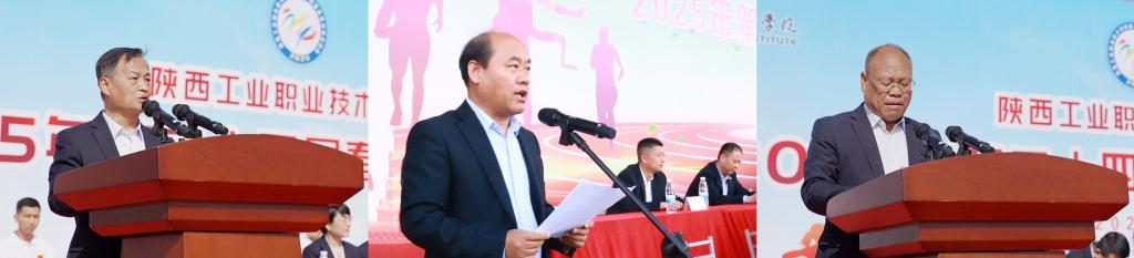 裁判员代表、运动员代表庄严宣誓,保证公正裁决、严守规程,确保比赛工作顺利进行。最后,党委书记惠朝阳、党委副书记贺天柱在两校区宣布:“陕西工业职业技术学院第二十四届春季田径运动会开幕!”