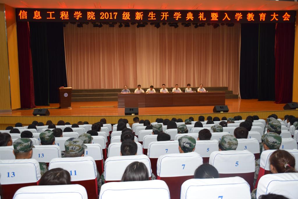 9月22日下午,信息工程学院2017级新生开学典礼暨入学教育大会在明德堂举行。出席大会的有院教务处副处长刘军旭,学生处副处长张科海,信息工程学院院长何玉辉,信息工程学院副院长殷锋社。何玉辉院长介绍了信息工程学院概况、师资力量、专业设置、实训条件及近年来技能大赛取得的成绩,并对2017级新生提出三点希望:一是希望同学们学会自我规划,提高专业素养和知识储备。二是希望同学们学会生活自理、思想自理、交际自理。三是希望同学们学会涵养自己的德性,学会遵从必要的规矩,学会自主学习的能力。