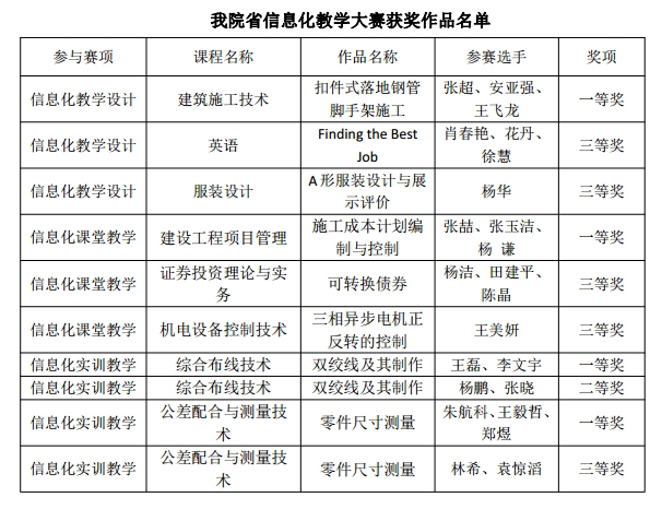 近日,根据省教育厅公布的2017年陕西省高等职业院校信息化教学大赛获奖名单通知(陕教〔2017〕288号),我院推荐的10件作品全部获奖,其中,张超、张喆、王磊、朱航科等的4件作品获得2017年陕西省高等职业院校信息化教学大赛一等奖,杨鹏的1件作品获二等奖,肖春艳、杨华、杨洁、王美妍、林希等的5件作品获三等奖。