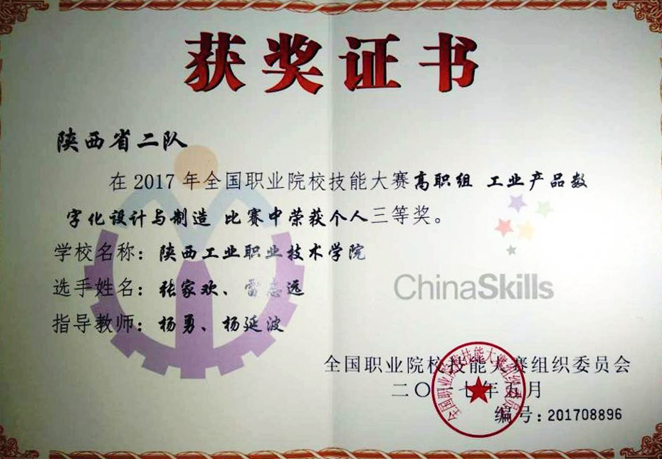 6月7日至8日,全国职业院校技能大赛高职组制造大类“工业产品数字化设计与制造”赛项比赛在苏州举行,由我院数控工程学院数控1501班雷志远、数控1502班张家欢两位学生组成的陕西二队荣获团体三等奖。