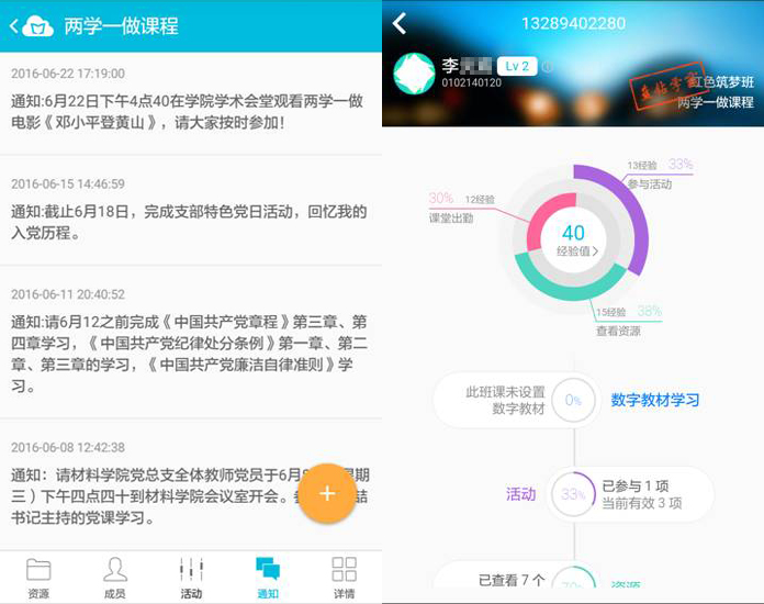 云班课是在移动网络环境下,基于移动智能设备开展课堂内外即时反馈互动教学的云服务平台。材料工程学院学生工作党支部利用移动APP云班课,创建红色筑梦班“两学一做”课程。利用手势签到对学生党员进行即时考勤,将党章党规、系列讲话等内容以文本、课件、视频、图片的形式上传到云端管理平台,建成丰富的系统化的学习资源,支部学生党员打开手机APP,就能随时随地利用点滴时间,进行要点式学习;也能利用云端课参与到头脑风暴、讨论、答疑等互动环节中,进行即刻反馈,即刻点评;材料工程学院学生工作党支部围绕“合格党员标准”等知识要点,编辑测试题对学习教育进行测试;同时支部学生党员的出勤、参与活动、查看资源、学习进度等都可从云班课后台进行查看与管控,让学习教育“可检测,可评价”。