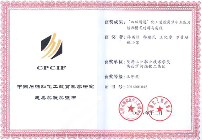 12月26日,全国石油和化工职业教育教学指导委员会2016年工作会议在北京召开,会议公布了第四届中国石油和化工教育科学研究成果奖评选结果。我院刘迪、尚华、纪惠军、李婧申报的《基于职业岗位标准的<石油化工工艺>网络课程建设与实践》荣获一等奖;孙琪娟、杨建民、王化冰、罗晋朝、张小军申报的《“四级递进”化工总控岗位职业能力培养模式创新与实践》荣获三等奖。全国职业教育教学指导委员会办公室主任王国川、石化行指委主任任耀生为其颁奖。