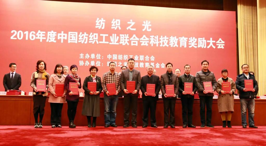 11月23日,“纺织之光”2016年度中国纺织工业联合会科技教育奖励大会在人民大会堂举行,中国纺织工业联合会及各专业协会领导、中国纺织工业联合会奖励委员会委员出席会议,为获得2016年度科学技术奖、教育教学成果奖、教师奖、学生奖、针织内衣创新贡献奖的获得单位和个人代表颁奖。我院化工与纺织服装学院贾格维教授应邀与会,并领取了教育教学成果一等奖获奖证书。