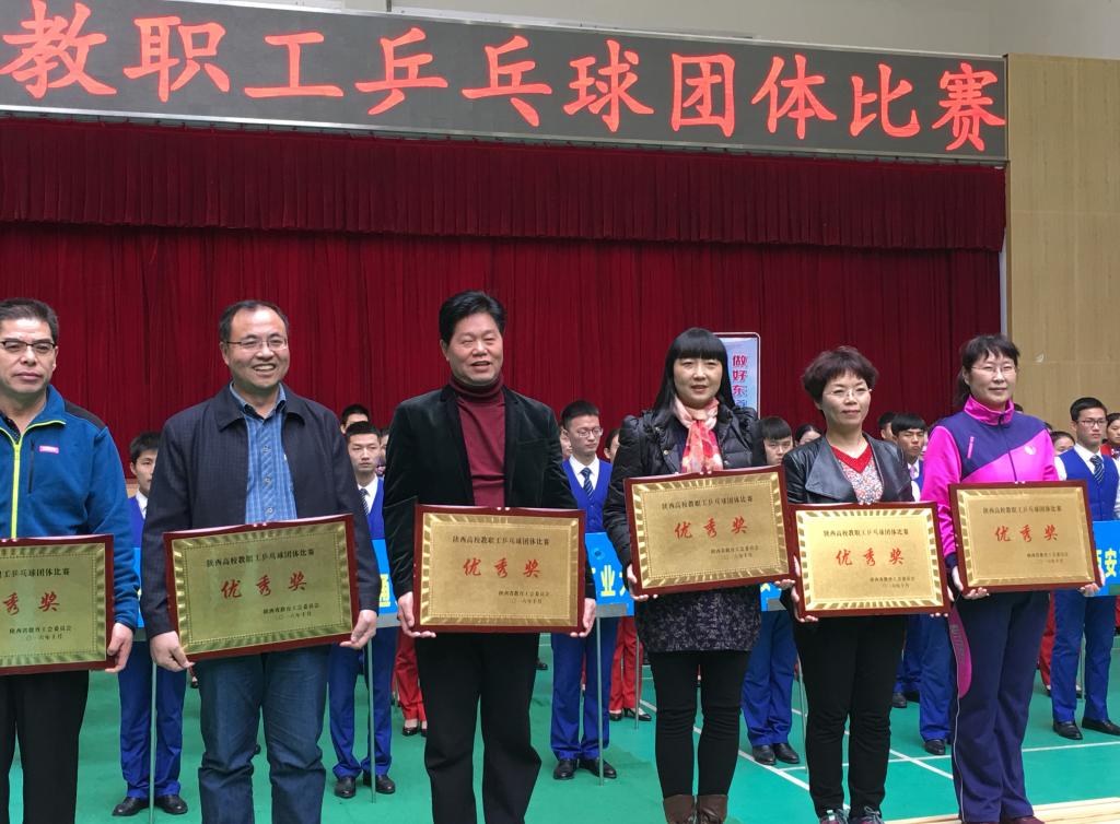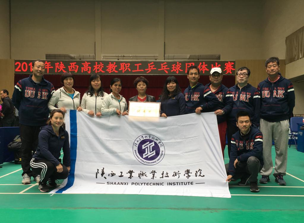 10月28日至30日,2016年陕西高校教职工乒乓球团体比赛在渭南市举行,由我院工会主席刘文青带队,杜翊、杭挥天、李红科及张辉、袁夏莹等11名队员组成的我院代表队参加了比赛。经过两个阶段激烈奋战,最终以高职院校第一名的历史最好成绩进入16强队,并与西电科大、西北农林科大、陕师大并列获得陕西高校教职工乒乓球团体比赛优秀奖,院工会主席刘文青代表学院上台领取了奖牌和奖金。