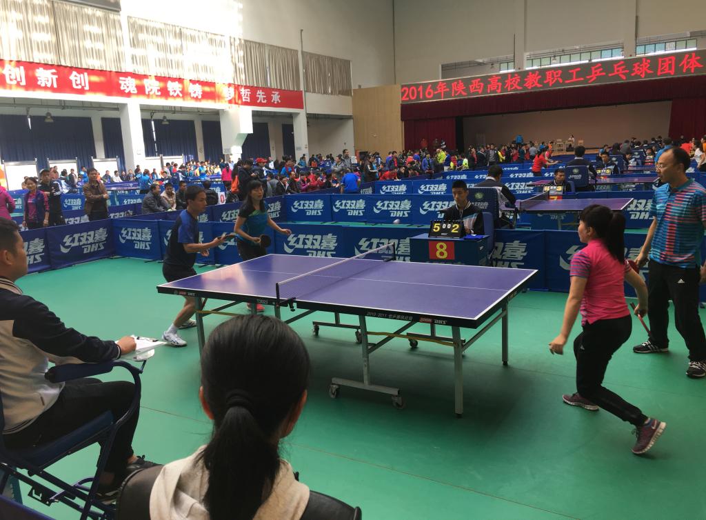 2016年陕西高校教职工乒乓球团体比赛共有55所高校的55支教职工队伍参赛,参赛队伍数、人数和比赛场次均刷新了历年记录。29日简短的开幕式后,我院即迎来了32强晋级小组循环赛,与同在H组的陕铁职院、西安外国语大学、陕西广电大学展开角逐。小组赛中,我方细致研究友队的战略战术和技术水平情况,合理安排我方比赛出场阵容,并讲究战略战术,及时调整上场队员心态;在势均力敌的情况下,我方以微弱优势杀出重围,凭借3场全胜、小组积分第一的骄人战绩夺得出线权。当天下午5点开始了16强队的淘汰赛,我院代表队遭遇较强对手——同在咸阳的陕财职院,经过我方合理安排上场顺序,参赛队员不断调整适应对方战术和打法,攻坚克难,最终以3局全胜的成绩让陕财职院无缘16强队。此时时钟已接近晚上7:00,我方队员经过下午两场10局的比赛人困马乏,但又来不及吃饭,只能补充饮水和以饼干水果充饥,让人无奈又心疼。晚上8:00即开始最受瞩目的8强淘汰赛,我院遭遇强大对手——所向披靡的延安大学代表队。比赛开始首局男子单打我院代表队不敌延安大学;我院代表队及时调整随后的女子单打项目战略战术,张辉老师不负众望,沉着应战、奋力拼搏,从头至尾双方你追我赶、屡战屡平、屡平屡战,直至比分上升至不分伯仲的12:12,场内外观众已如大兵压境之势将赛场围的水泄不通。最后关头,张辉老师抓住发球先机以14:12的比分赢回一局;但随后的两局混合双打、男子双打项目,我院代表队犹如虎口夺食,打得异常惨烈,在观众的一片惋惜之声中最终被对手艰难拿下。整个比赛持续了两个半小时之久,比赛过程紧张激烈、艰苦卓绝;但比赛亮点频出、高潮迭起。我院代表队此次出征陕西高校教职工乒乓球赛虽然止步8强队,但作为唯一一所晋级16强队的高职院校,实现了赛前既定目标,打出了水平,拼出了风采,完美展现了“追求卓越,争创一流”的陕西工院精神,我院代表队不畏强敌,努力奋斗的历程让人印象深刻,也成为比赛的一道靓丽风景。高职院校总成绩第一的成绩,让其他本科兄弟院校刮目相看,也为全省高职院校赢得了赞许和满堂喝彩。