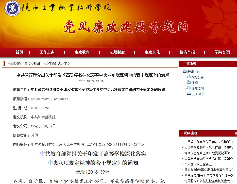 根据省高教工委要求,10月24日,我院及时落实文件精神,院纪委通过OA系统向全院处级以上领导干部转发了《规定》(教党[2016]39号)全文,并在学院“党风廉政建设”专题网站主页转载了《规定》全文,同时要求各党总支、各部门党政领导班子要把《规定》作为“两学一做”学习教育的重要内容,安排专题学习,研究并确定本单位贯彻落实重点及相关措施,从而助推《规定》贯彻落实。