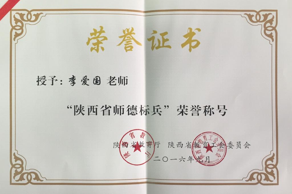 近日,陕西省教育厅、省教育工会组织的陕西省2016年师德先进评选活动中,我院教师李爱国被授予“陕西省师德标兵”荣誉称号。
