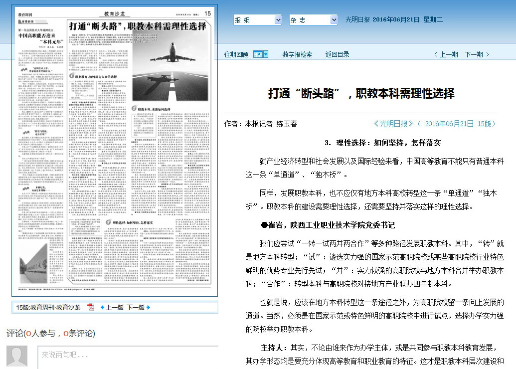 6月21日,《光明日报》在第15版(教育周刊)刊发了题为《打通“断头路”,职教本科需理性选择》的文章,选取了我院党委书记崔岩教授在参加该报举办的“教育沙龙”时,就“职教本科建设的理性选择”的发言,现将文章摘转如下: