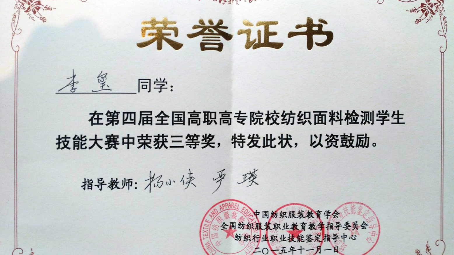 10月31至11月2日,全国高职高专学生第四届“纺织面料检测技能大赛”在江苏南通举行,经过三天的激烈角逐,圆满落幕,我院化工与纺织学院纺织品检验与贸易1301班李玺同学荣获三等奖;张阳、张艳娇、惠冰雪、石美静等四名同学获得优秀奖。