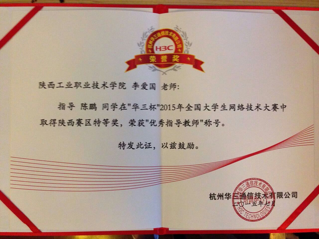 近日,2015年“H3C杯”全国大学生网络技术大赛陕西赛区比赛在西北工业大学落幕,我院信息工程学院计应1201班陈鹏同学取得了预赛第二名、复赛第一名的优秀成绩,并获得陕西赛区特等奖,指导老师李爱国获“优秀指导教师”称号。