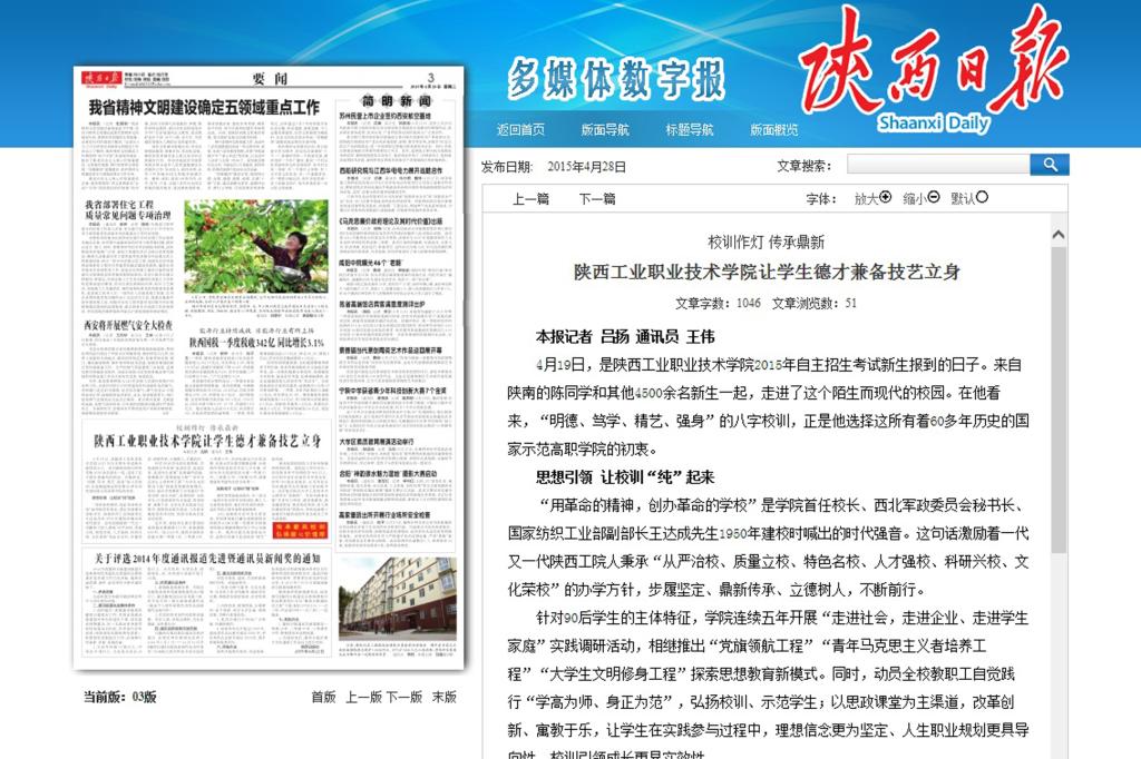 4月28日,《陕西日报》以《校训作灯,传承鼎新——陕西工业职业技术学院让学生德才兼备、技艺立身》为题,聚焦我院“明德、笃学、精艺、强身”校训背后的故事,现将全文转载如下: