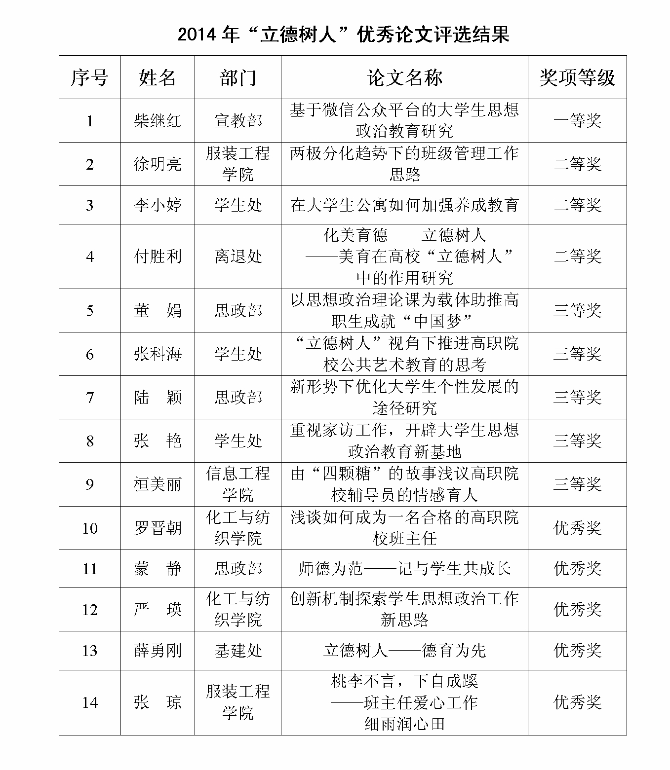 日前,由思政部、科研处牵头组织的2014年“立德树人”论坛系列活动之大学生思想政治教育工作优秀论文征集评选结果揭晓。经严格评审,宣传教育部柴继红、服装工程学院徐明亮、思政部董娟、化工与纺织学院罗晋朝等14位同志分别获得优秀论文评选一、二、三等奖及优秀论文入围奖。