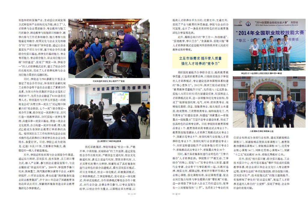 另外,学院还积极拓展与企业深度合作渠道,通过双向调研、顶岗实习、技术服务、员工培训等方式,融入产业圈,参与到企业建设发展中,与企业凝结成“命运共同体”。2009年,学院携手秦川机床、陕柴重工、陕汽集团等20家骨干企业、4家科研院所、11所职业院校,牵头组建“陕西装备制造业职业教育集团”,并于2011年启动了国家教育体制改革试点项目,探索陕西装备制造业职业教育集团化办学新模式。