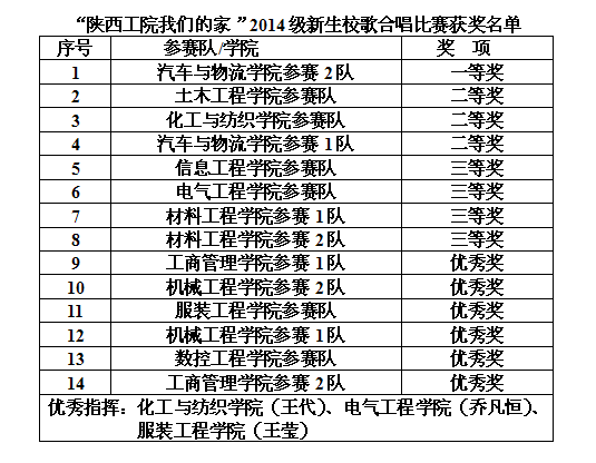 11月12日下午,2014级新生校歌合唱比赛在明德堂礼堂举行。本次比赛由学生工作部、学生处举办,主题为“陕西工院我们的家”,指定曲目为《陕西工业职业技术学院校歌》,可采取朗诵、领唱等多种表现形式,为庆祝我院建校64周年,同时也是新生入学教育的重要环节,旨在通过比赛提升精气神,凝聚爱国、爱校热情,增强集体荣誉感。