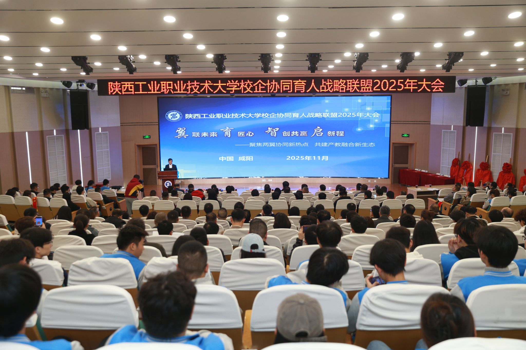 11月15日,陕西工业职业技术大学校企协同育人战略联盟2025年大会顺利召开。校党委书记惠朝阳、校长刘永亮出席会议并讲话,咸阳市高新区科创局局长冯伟、党委副书记马晓云、副校长梅创社以及兄弟院校各级领导、行业企业合作伙伴400余人相聚我校,共叙往昔深厚情谊,共谋产教育人发展大计。大会由党委副书记贺天柱主持。