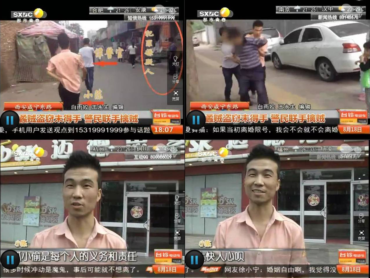 新闻中说,当日上午9时许,在西安市咸宁东路,一名偷车贼想用调虎离山之计偷三轮车,被车主当场识破后仓皇逃窜。在场的陈风军同学闻讯立即与执勤便衣民警谭警官追赶偷车贼,并协助民警将其当场抓获。事后接受记者采访时,他表示:“抓小偷是每个市民应尽的义务,感觉大快人心”。陈风军同学这种见义勇为,传递社会正能量的行动赢得了在场群众的交口称赞。