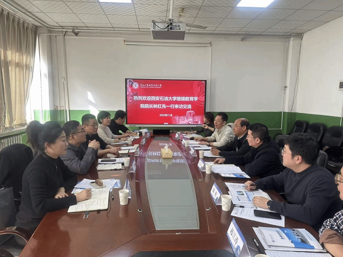 梅创社代表学校对林红先一行人到来表示欢迎。继续教育学院副院长贾严鹏对我校继续教育工作的基本情况、业务板块、以及近年来取得的成绩做了详细介绍,重点阐述了我校在学历继续教育、社会培训、师资培训、职业技能证书等方面工作开展情况。西安石油大学继续教育学院副院长丁昌峰对西安石油大学基本情况、继续教育工作的发展现状做了详细介绍。