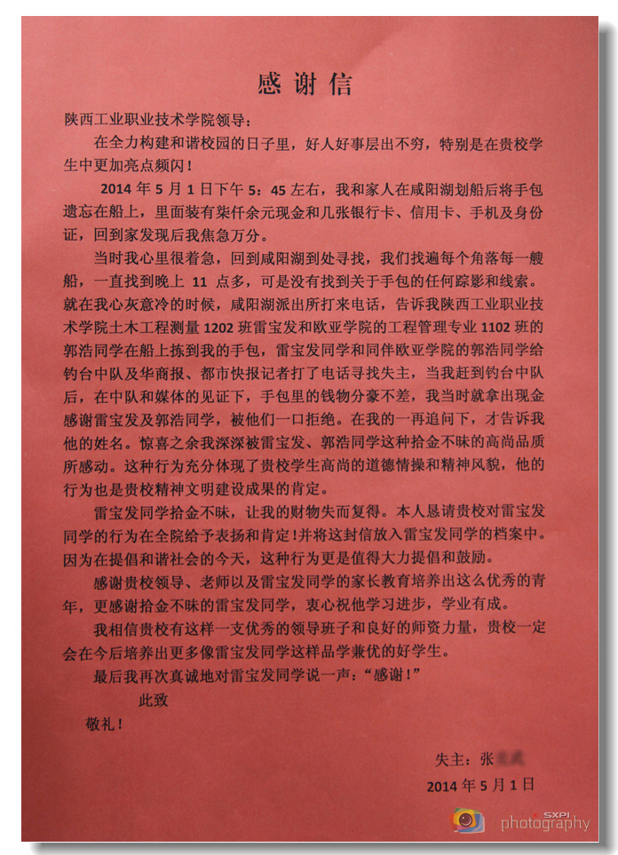 5月4日下午,兴平市的张先生专程来到我院,为土木工程学院工程测量1202班雷宝发同学送来感谢信,感谢雷宝发同学在他不慎遗失装有7000余元现金和几张银行卡、信用卡、手机及身份证的手包后,拾金不昧、积极寻找失主的行为,并称赞我院教育出了好学生、好青年。