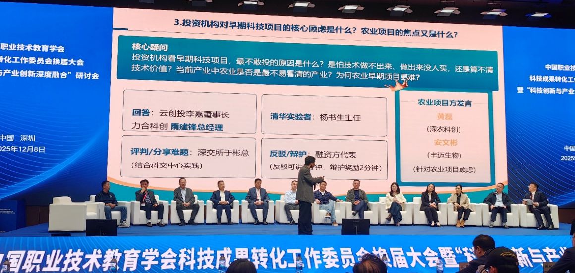 大会还围绕“科技成果转化人才培养”“科技成果供需对接”“‘双高’院校专业群对接产业链”和“科技金融发展”4个议题举行了平行研讨会,惠朝阳参加了圆桌会议环节,与13位高校、企业、创投机构代表跨界对话,共同探讨科技成果转化的关键路径与长效机制。