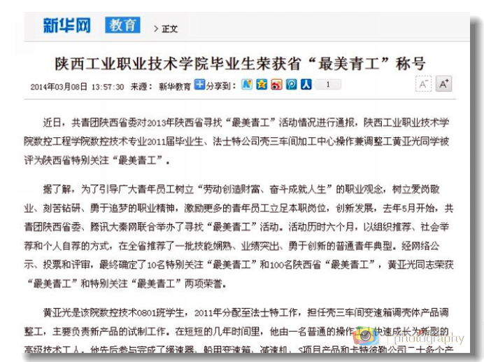 3月8日,新华网以《陕西工业职业技术学院毕业生荣获省“最美青工”称号》为题,报道了我院优秀毕业生黄亚光。黄亚光为我院2011届毕业生,在校期间表现优秀,多次参加省级和国家级技能大赛获奖。