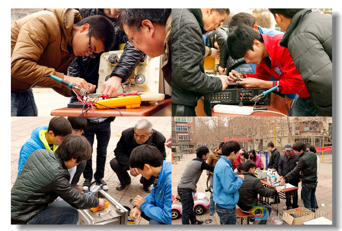 电器维修协会的志愿者利用双休日,在同乐园广场为师生义务维修小家电。他们冒着春寒,牺牲自己的休息时间,用微笑和专业的维修技术让师生们竖起了大拇指。