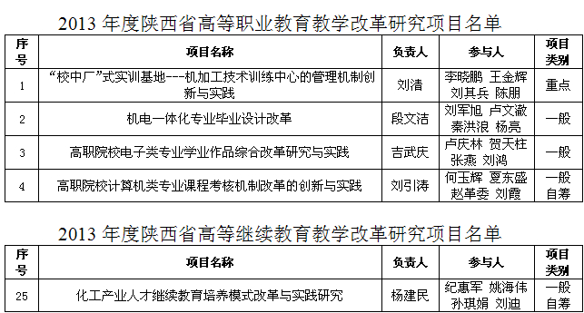 近日,根据省教育厅《关于对2013年度陕西省高等职业教育和继续教育教学改革研究项目进行公示的公告》,我院申报的五个项目通过了专家评审并获得立项,其中重点项目一个,一般项目四个。