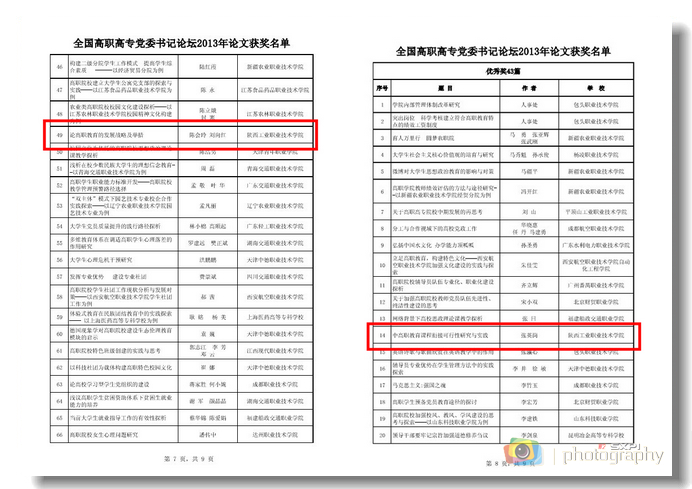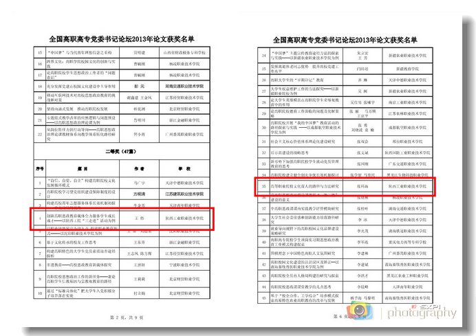论坛以“党建引领育人”为主题,以提高高职高专院校党建科学化水平,推进高等职业教育科学发展为宗旨,总结了过去一年的主要工作,对2013年论文征集活动进行了表彰奖励。我院王伟撰写的《创新高职思政教育载体,服务学生成长成才——以陕西工院“三走进”活动为例》一文获得二等奖;张科海撰写的《高职院校文化育人的路径与方法研究》,陈会玲、刘向红撰写的《论高职教育的发展战略与举措》获三等奖;张英岗撰写的《中高职教育课程衔接可行性研究与实践》一文获优秀奖。
