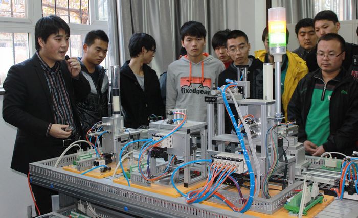 首先,继专业教育之后,电气工程学院召开试点班学生座谈会,详细了解试点班学生近两个月的学习、生活情况,并就学生在专业课程学习过程中遇到的问题进行解答。此外,为了使学生明确我院试点教学改革内容及主要举措,相关教师还对试点班的教学改革计划进行了系统说明。其次,为增强专业认知学习,增进试点班学生对电气学院实训基地的感性认识,11月29日下午,试点班学生在自动化教研室主任王永康的引导下,现场观摩了欧姆龙自动化技术实训室、过程控制技术实训室、自动化网络集成技术实训室、工业机器人与智能视觉技术实训室等新建实训室。