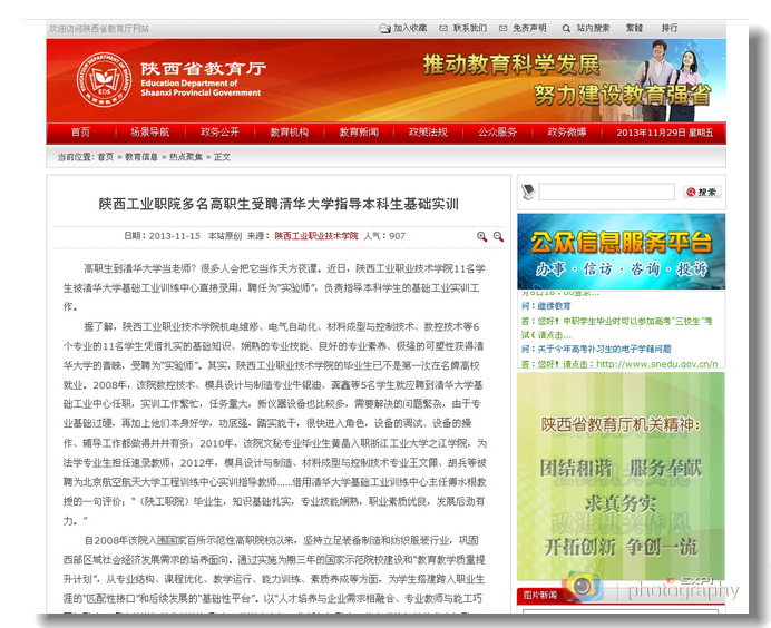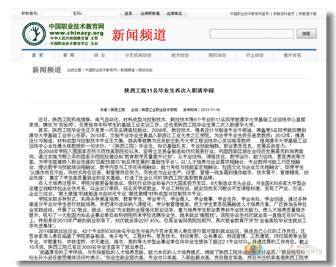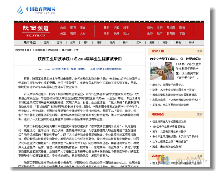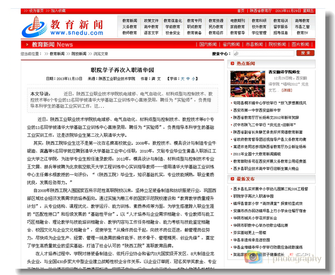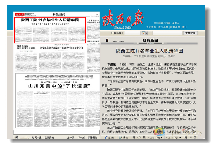 11月26日,《陕西日报》科教版头条以“陕西工院11名毕业生入职清华园”为题刊发消息,对我院教育教学改革、毕业生就业等工作进行报道。《华商报》、中国教育新闻网、陕西省教育厅网站、中国职业技术教育网、陕西教育网等多家媒体也分别进行了报道,各媒体链接如下: