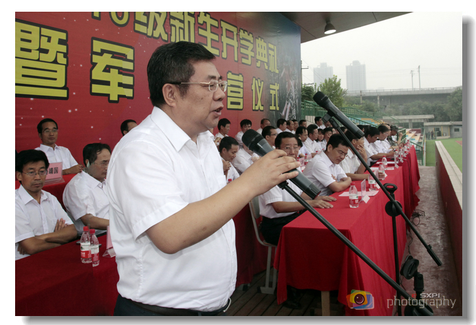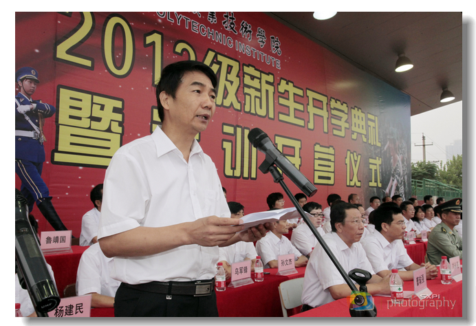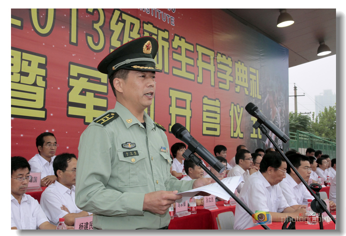 党委副书记王天哲宣布军训编制及任命,在校生和新生代表先后发言。党委书记邓志辉为2013级新生军训团授旗并宣布2013级新生军训开营,为期10天的新生军训工作全面启动。