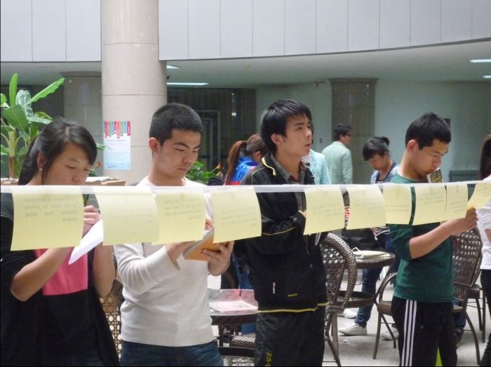 活动题目由工作人员从银符考试题库中的英语A、B级和计算机一、二级等级考试中随机抽取,答对即可领取奖品。活动现场,同学们参与热情高涨:或独立场边凝神思考,或三五一群研究答案,或拿出手机上网搜索,尤其是一等奖的英译汉题目,更是让学生们绞尽脑汁。兑奖处,更是不时传来答对题的欢呼声和答错后的幽默调侃。
