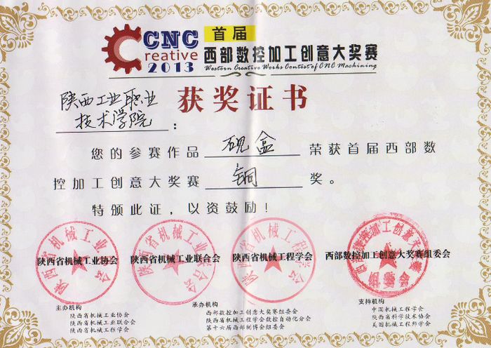 首届“西部数控加工创意大奖赛”由陕西省机械工业协会、陕西省机械工业联合会、陕西省机械工程学会主办,陕西省机械工程学会数控自动化分会、第十六届西部制博会组委会承办,是首次结合数控加工和创意设计的作品与技能大奖赛。大赛旨在进一步响应我国政府提出的“大力发展高端装备制造业”以及“创新中国”和“文化强国”的号召,充分展示西部装备制造业的机械加工实力和技能,深入调动机械加工人才使用高端数控加工设备、钻研加工技术的积极性、主动性和创造性,将先进科技与文化艺术有机融合并进一步提升。