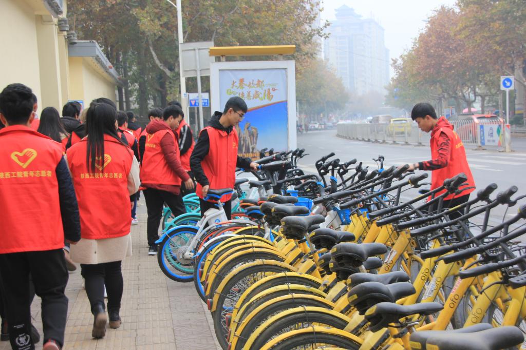 冒着寒风和细雨,志愿者们按照规划线路从学校南门出发,将沿途随意停放的共享单车停放到指定区域并摆放整齐。与此同时,引导市民规范停车,倡导市民做文明的骑行者、文明的停放者、文明的宣传者。在大家的共同努力下,校园周边站点的共享单车全部整理完毕,道路更加通畅,车辆通行更加安全,得到了来往行人的一致好评。