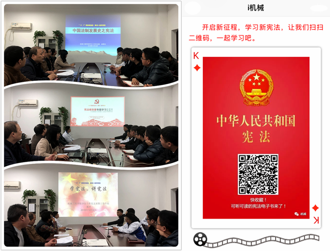 此外,机械工程学院以“普及法律知识,弘扬宪法精神,培育法治观念”为主题,搭建O2O学习微平台,开展“我们一起学宪法”主题活动,引导广大师生做宪法的崇尚者、遵守者、捍卫者,在全院师生中掀起学习宪法新高潮。