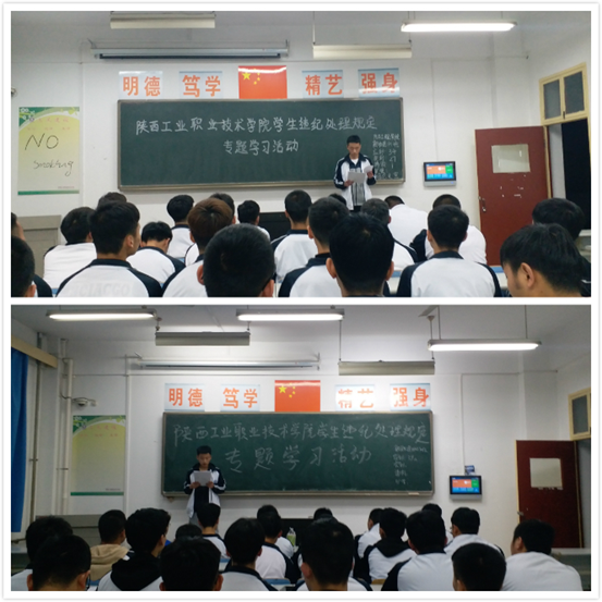 为进一步落实学院《关于开展学生安全教育及校园吸烟集中整治活动的通知》的文件精神,强化校风校纪,优化育人环境,3月28日晚,汽车学院利用晚自习时间,在各年级组织开展了学生违纪处理规定专题学习活动,本次活动由各班班长主持。
