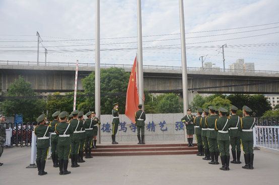 7点整,升旗仪式正式开始。英姿飒爽的国旗护卫队护送鲜艳的五星红旗走向升旗台,伴随着庄严的《义勇军进行曲》,五星红旗冉冉升起,全体师生肃立凝视,行注目礼,奏唱国歌。