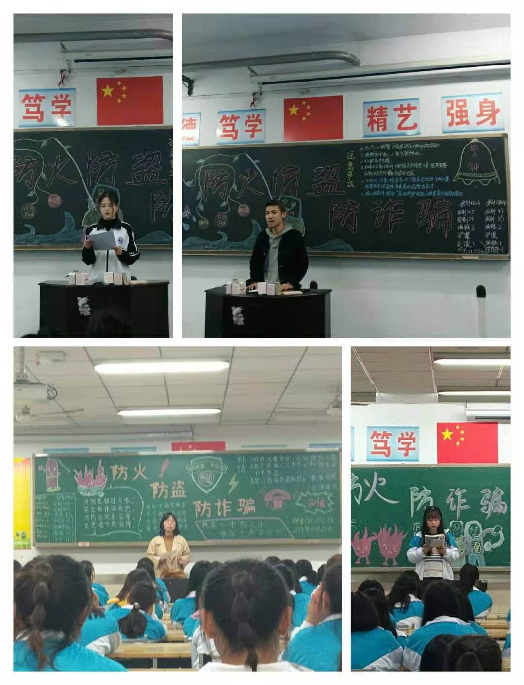 在班会上,各位老师首先呼吁大家一定要做好秋冬季防火防盗工作,提醒大家养成出门随手关好门窗的习惯,提高防卫意识。注意校园安全(尤其是宿舍安全),室内禁止使用明火及大功率电器,人走断电、学会一些防火逃生办法、基本自救技能;财产安全(如电信、电商及网络诈骗),遇事需保持冷静提高警惕,养成良好习惯,保管好自己的现金、储蓄卡和贵重物品,对诈骗信息做到“三不一要”,即不相信、不理睬、不联系,要及时报案;疾病安全包括饮食、运动伤病、用药及心理等问题的预防。紧接着,学生代表上台发言,就班会上提到的安全教育内容,结合身边的实例发表言论和感想,引起在场同学的共鸣。这次专题安全教育班会主要内容是传播安全知识,传递安全技能,并结合高校易发生的几种盗窃、诈骗形式,通过现实案例,图文并茂地向同学们传授基本的防火、防盗、防诈骗技能。