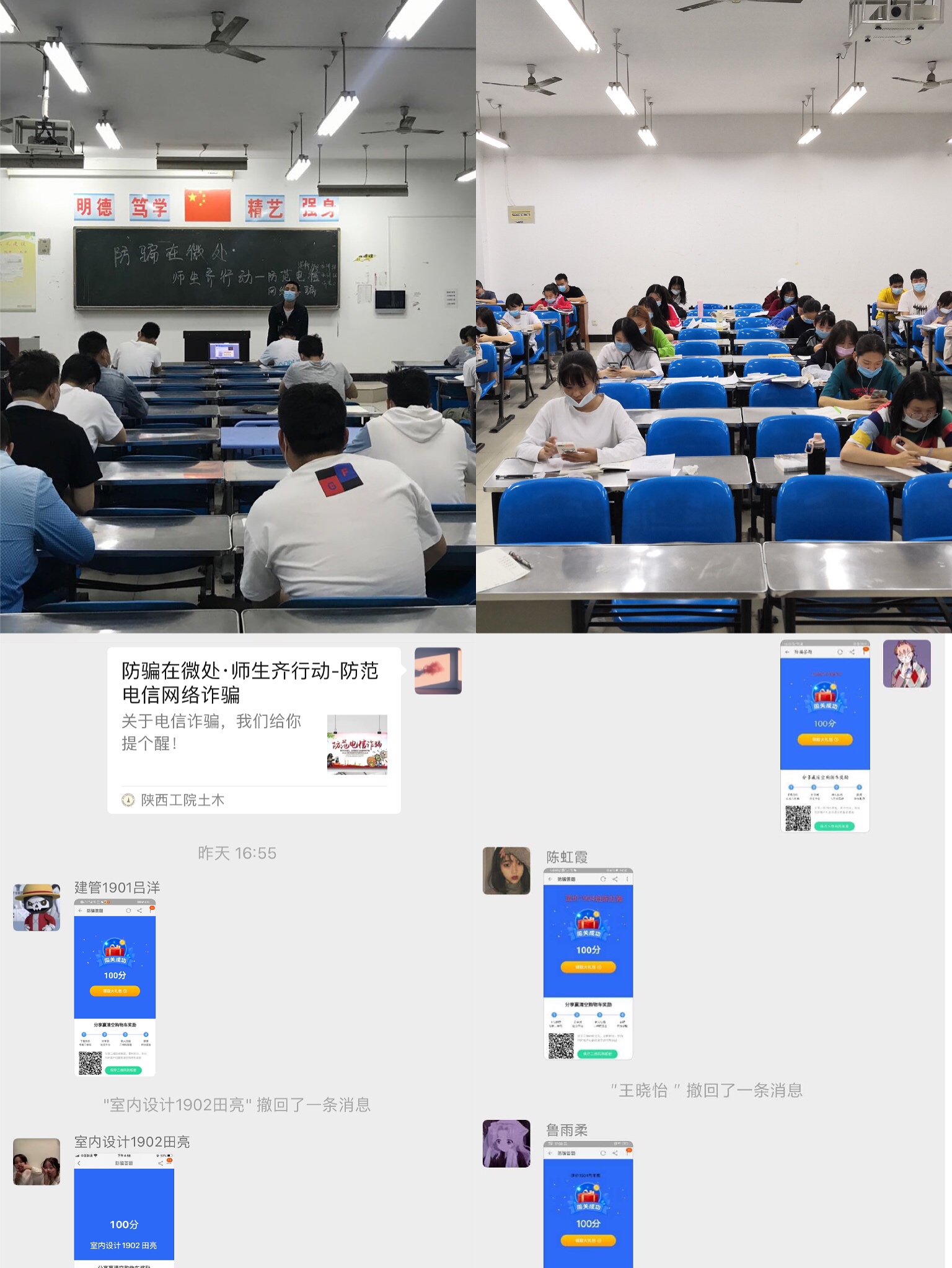 为压制电信网络诈骗高发态势,提升广大师生员工防范电信网络诈骗意识,有效遏制案件发生,5月24日,土木工程学院组织全体学生参加由阿里巴巴、百城公安推出的主题为“防骗在微处,百城齐行动”的全民互动参与防骗答题活动,并利用晚自习时间组织2018级学生开展防范电信网络诈骗主题班会。