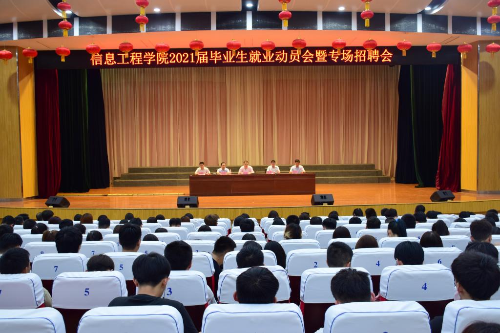 9月7日下午,信息学院2021届毕业生就业动员大会暨专场招聘会在明德堂举行。就业指导处处长卢文澈、信息学院党总支书记闫军、教学办主任宋承继、学工办主任穆昌、2021届年级辅导员、班主任及全体毕业生参加了大会,就业动员大会由闫军主持。